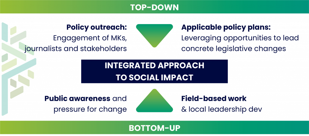 We develop future democratic leaders by building their capacity and integrating them into public service, civil society, labor, local government, to create lasting impact across Israeli society.